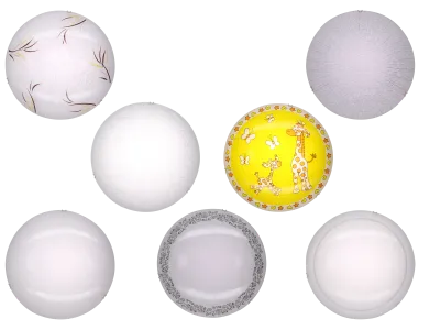 Основание изготовлено из металла, на котором закреплен светодиодный модуль. Плафон — из непрозрачного стекла, есть чисто белый вариант, а также несколько стильных рисунков: хаотичный рисунок, круговой орнамент или детский мультик. Мощность светильника составляет 8Вт, цветовая температура — 3000К. Высота моделей — не более 7см, поэтому их можно устанавливать на натяжные потолки или в помещениях с невысокими потолками.