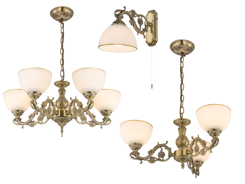 Корпус светильников выполнен из металла с литыми элементами и имеет роскошный бронзовый оттенок. Плафоны изготовлены из матового белого стекла, дают мягкий и равномерный свет.