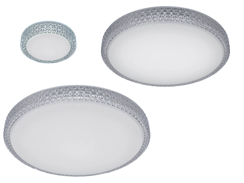Основание изделий металлическое, плафон изготовлен из специализированного оптического полимера с белой глянцевой поверхностью, покрытой мельчайшими прозрачными вкраплениями, создающими эффект звездного небосвода. Модели украшены по краю прозрачной окантовкой из прочного полимера с алмазной огранкой. Все это вместе создает неповторимый, причудливый рисунок света с яркими переливами. Современные светодиоды обеспечивают качественное мягкое и равномерное освещение, без мерцания и пульсаций, которое не вредит глазам.