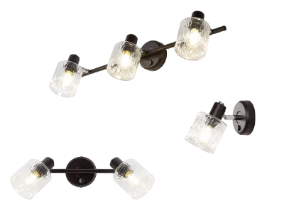 Корпус светильников металлический, популярного оттенка венге. Плафоны — стеклянные, прозрачные, в форме цилиндра, с объемным рисунком, напоминающим застывшие струи воды. Они закреплены на поворотных шарнирах, которые позволяют направлять поток света в разные стороны; плафоны вращаются независимо друг от друга. Таким образом, вы можете создавать свою собственную, неповторимую конфигурацию света. В изделиях используются лампочки с цоколем Е14, которые нужно будет купить отдельно.