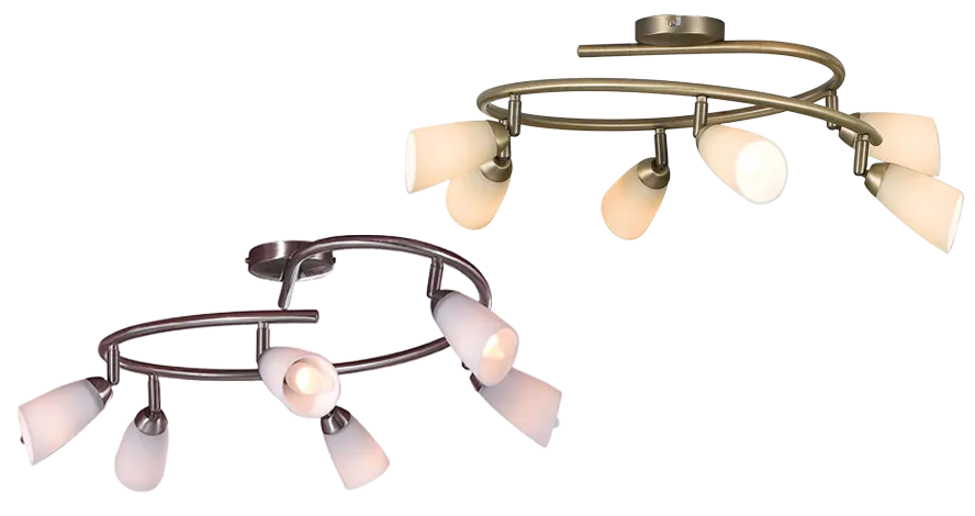 Каркас светильников — металлический, на выбор два оттенка: матовый хром или благородная бронза; штанга, на которой закреплены споты, закручена в спираль. Плафоны из матового стекла со скошенным краем напоминают цветочные бутоны, мягко рассеивая свет в помещении. Для хромированного корпуса используются белые плафоны, вместе с бронзовым каркасом — песочного оттенка.