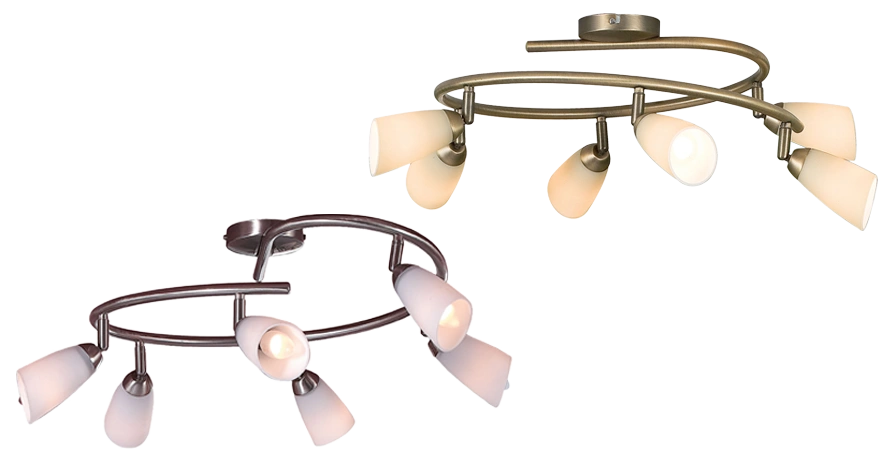 Каждый плафон можно поворачивать независимо от других, создавая разнообразные световые акценты в помещении, что делает споты универсальным решением для организации как общего, так и локального освещения. Сменные плафоны, входящие в серию, позволяют разнообразить внешний вид светильников, комбинируя разные цветовые решения. Для всех светильников следует выбирать лампы с цоколем Е14.