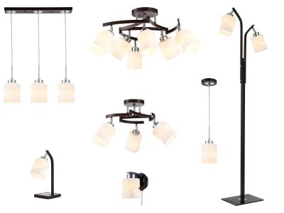 Открывают серию потолочные люстры на 3 и 6 плафонов, с поворотными рожками и плафонами, — конфигурацию светильника легко меняется, создавая свой собственный, неповторимый силуэт. Для подсветки обеденного стола можно использовать подвесные варианты на три плафона или одиночные подвесы, для локального света подойдут торшер с двумя плафонами, настольный и настенный светильники.