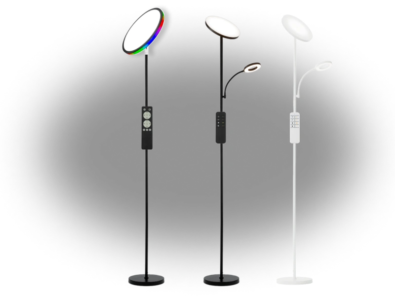 Корпус торшеров металлический, окрашен матовой краской. Модели со вторым модулем доступны в двух классических цветах: черном и белом, вариант с RGB-подсветкой плафона представлен только в черном исполнении. Поворотные плафоны — из оптического полимера.