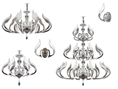 Каркас изделий металлический, с гальваническим покрытием стильного хромированного оттенка. Светодиодные рожки-модули — из оптического акрила, с боковыми накладками цвета хром и декором из сверкающего хрусталя. Люстры дополнительно украшены декоративными элементами из прозрачного хрусталя.