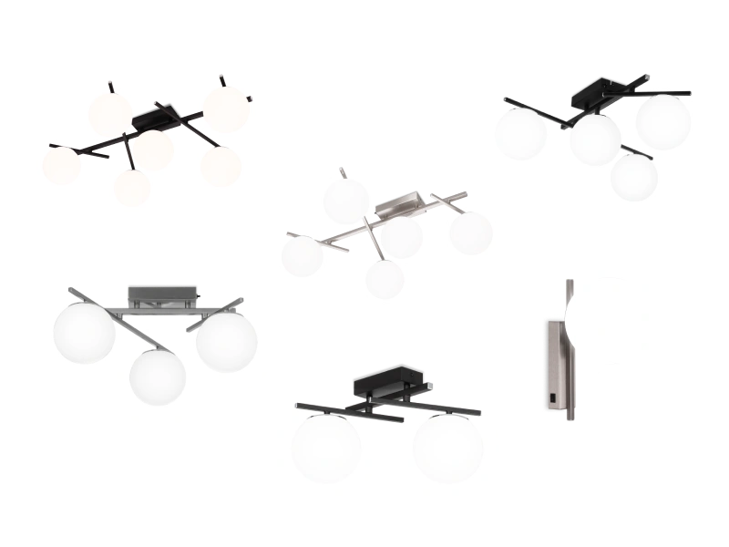 Корпус изготовлен из металла, на выбор два модных оттенка: черный или матовый хром. Плафоны-сферы — из ударопрочного полимера белого матового цвета.