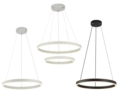 В серии представлены потолочные модели разной мощности с независимой потолочной подсветкой, круглые подвесные люстры с одним, двумя или тремя кольцами, подвесные люстры с двумя или тремя квадратными модулями, подвесы с одним кольцом, подвешенным горизонтально или вертикально, а также каскадные модели на три и пять колец и элегантные светодиодные настенные светильники.
