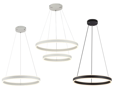 В серии представлены потолочные модели разной мощности с независимой потолочной подсветкой, круглые подвесные люстры с одним, двумя или тремя кольцами, подвесные люстры с двумя или тремя квадратными модулями, подвесы с одним кольцом, подвешенным горизонтально или вертикально, а также каскадные модели на три и пять колец и элегантные светодиодные настенные светильники.
