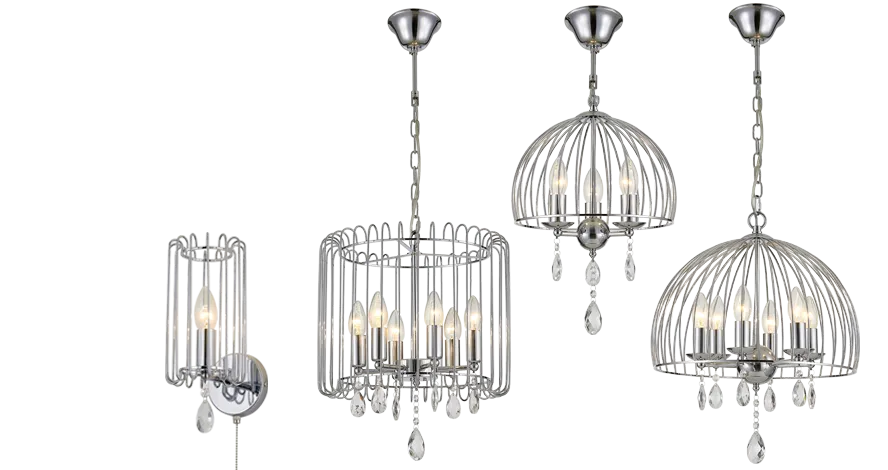 Корпус — металлический, хромированный. Абажуры подвесных моделей — двух видов: в форме цилиндра или куполообразной формы, для бра выбран только цилиндрический каркас. Тонкие линии металлических абажуров придают светильникам особый шарм и утонченность, делая их центральным элементом любого интерьера. Особый шарм добавляют декоративные хрустальные подвески каплевидной формы.