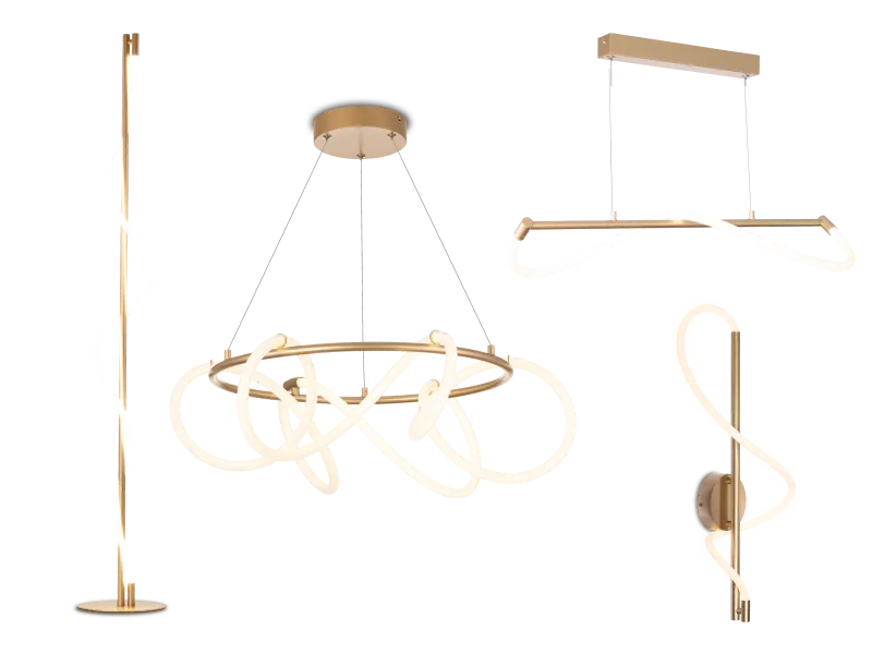 Корпус изделий изготовлен из металла, окрашенного в благородный золотой цвет. Источник света — гибкий светодиодный рассеиватель, изготовленный из силикона. Сам рассеиватель мягкий и прочный, практически не нагревается при работе. Обеспечивает комфортное освещение с нейтральной цветовой температурой в 4000К.