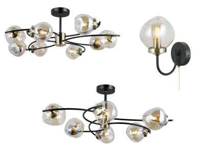 Черные металлические рожки сочетаются с бронзовым декором. Плафоны имеют необычную форму, изготовлены из прозрачного стекла с легкой тонировкой цвета шампань. Причудливые изгибы и асимметричные линии создают неповторимую игру света и тени, придавая интерьеру особую глубину.