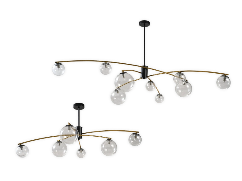 Плафоны сферической формы, изготовлены из прозрачного стекла. Плафоны разного размера: на каждой дуге с одной стороны закреплен шар побольше, с другой стороны — один или два плафона меньшего диаметра. Благодаря длинным штангам люстра визуально занимает большое пространство, наполняя помещение светом.