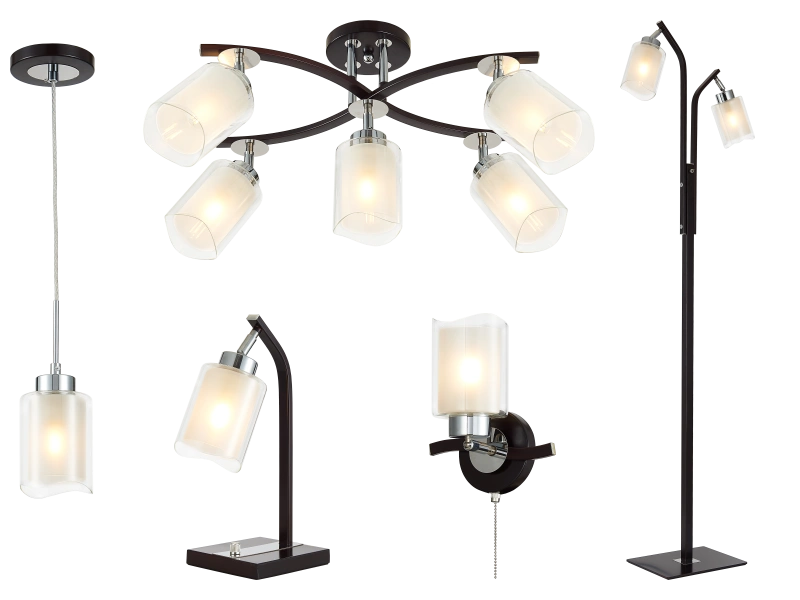 Корпус моделей металлический, стильного кофейного оттенка, дополненных стильными элементами декора цвета хром. Плафоны выполнены из стекла, имеют двойную конструкцию: внутренний белый матовый цилиндр обрамлен внешним прозрачным плафоном с волнистым краем. Такая форма обеспечивает качественное освещение и равномерное распределение света. В изделиях следует использовать лампочки с цоколем Е27 (не включены в комплект).