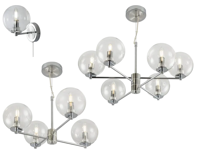 Корпус изделий изготовлен из металла, сочетаются глянцевые и матовые хромированные элементы. Прозрачные стеклянные плафоны имеют форму сферы. В люстрах горизонтальные штанги имеют поворотную конфигурацию, позволяющую менять силуэт светильника. Высоту подвесов также можно регулировать.