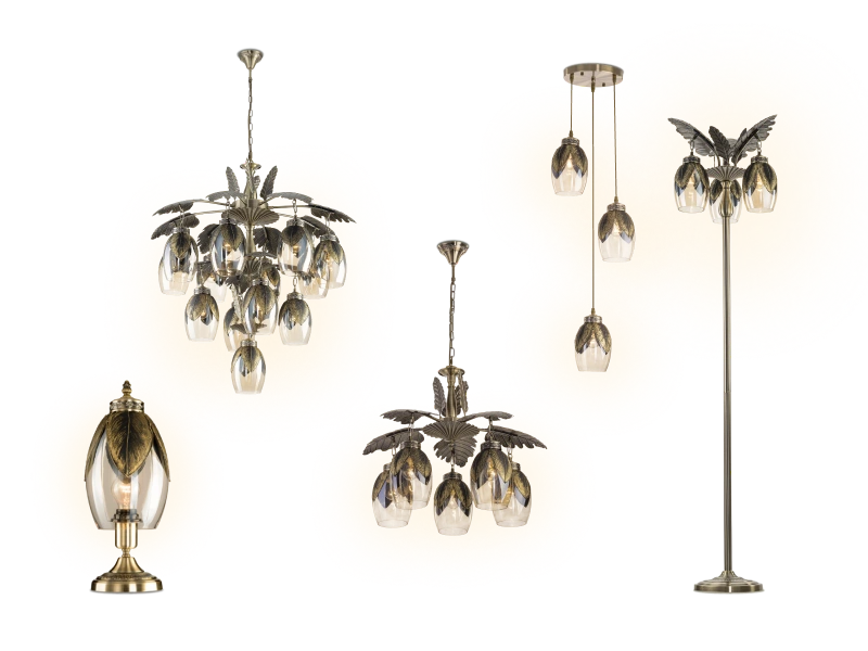 Декоративные элементы бронзового цвета обрамляют стеклянные плафоны светло-янтарного оттенка, образуя как бы бутоны диковинных цветов на тонких прямых или изогнутых стеблях. Люстры и светильники в классическом стиле предназначены для помещений с высокими потолками, освещаемая площадь колеблется от 3 до 31кв.м в зависимости от разновидности светильника, общая мощность — в диапазоне от 75 до 675Вт.