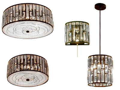 Каркас изделий — металлический, модного кофейного оттенка. Хрустальные элементы на боковых гранях, искрящиеся всеми цветами радуги, заполняют помещение особым волшебством, подчеркивая изысканную обстановку комнаты. В потолочных люстрах нижняя часть плафона выполнена из матового стекла со сложным геометрическим рисунком прозрачных линий.