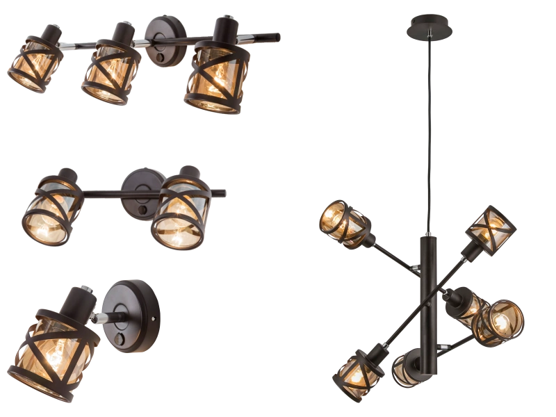 Корпус изделий металлический, стильного кофейного оттенка, плафоны цилиндрической формы — из прозрачного стекла с легкой светло-янтарной тонировкой, защищенные металлическим каркасом из листового металла. Плафоны в спотах закреплены на шарнирах, каждый плафон вращается независимо от других. Люстре можно придать разные силуэты, меняя положение рожков, ее высоту можно регулировать в зависимости от ваших предпочтений, или вообще собрать в потолочном варианте.