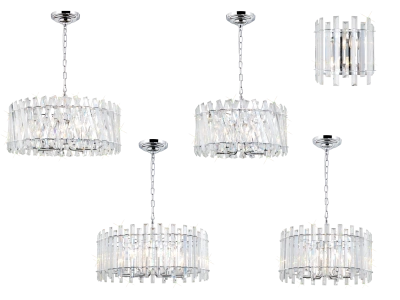 В состав коллекции вошли хрустальные подвесные люстры разного диаметра: на 6, 8 и 10 ламп.