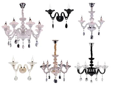 В серию включены подвесные люстры на 5 и 8 рожков, которые дополняют настенные светильники на два рожка.