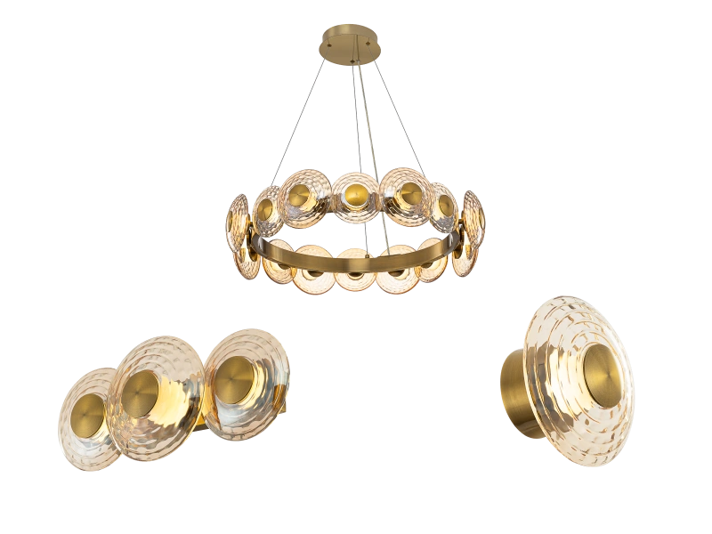 Каркас светильников — из металлического сплава оттенка латуни. Круглые плафоны — из стекла с янтарной тонировкой, украшенные круговым рисунком. В люстре используется светодиодный модуль с рассеивателем из оптического полимера.