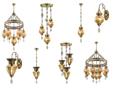 Люстры на 7 плафонов, тройные и одинарные подвесы доступны со всеми видами плафонов; бра — с обоими видами прозрачных плафонов, настольные лампы и люстры на 9 плафонов — с шарообразными медовыми и мозаичными плафонами, а люстра на 13 плафонов — только с шарообразными плафонами с медовым оттенком. Плафоны крепятся к корпусу на специальные подпружиненные лапки, их легко и просто снять.