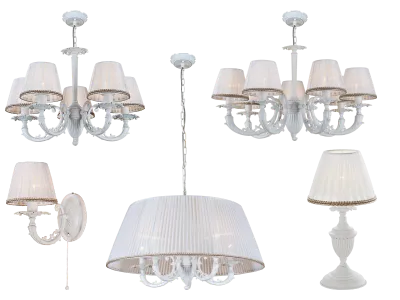 Каркас изделий — металлический, благородного белого оттенка. Абажуры классической формы из белого плиссированного текстиля создают мягкий, рассеянный свет. Во всех люстрах используются лампы с цоколем Е14.