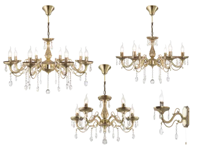 Основу коллекции составляют подвесные люстры с открытыми рожками, на 5, 6 и 8 рожков, дополняет модельный ряд элегантное бра на стену.