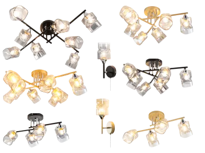 Основную часть серии занимают потолочные люстры с симметрично расположенными плафонами, есть варианты на четыре, шесть и восемь плафонов. Для дополнительного освещения отличного подойдут настенные бра с одним плафоном.