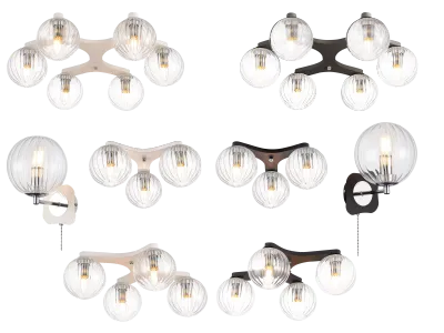 Корпус изделий изготовлен из металла, окрашенного матовой краской, на выбор предоставляется два классических оттенка: черный либо белый. Элегантный внешний вид дополняют декоративные элементы с хромированной отделкой. Плафоны-сферы — из прозрачного рифленого стекла. Их легко и просто собрать: плафоны без усилий накручиваются на основание патрона. Для всех изделий серии необходимо приобретать лампочки с цоколем Е14 и с колбой в форме свечи.