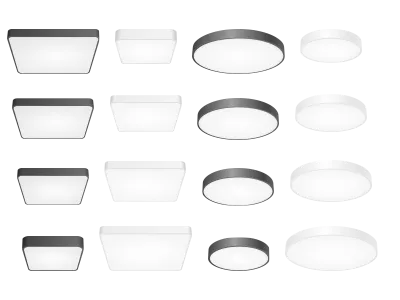 Светодиодные изделия с цветной подсветкой представлены в двух вариантах: квадратные, мощностью 70, 95 и 105Вт, а также круглые светильники, мощностью еще и в 155Вт. Есть также «младшие» модели, в форме квадрата и круга, мощностью 24Вт, с трехступенчатым диммером.