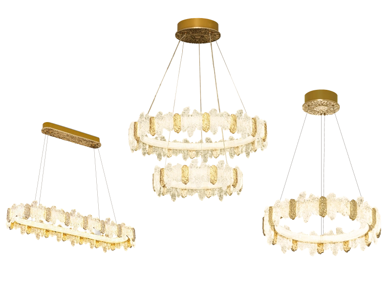 Жемчужиной коллекции является роскошная каскадная люстра на шесть подвесных колец, ее дополняют люстры с одним и двумя подвесными кольцами, а также небольшое дизайнерское бра.