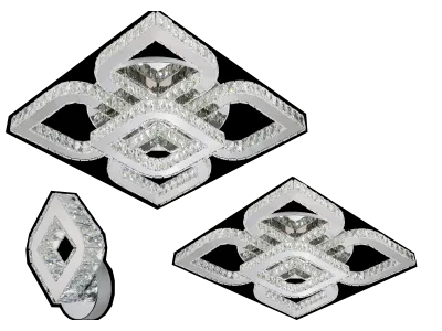 Каркас — из хромированной стали, светодиодные модули ромбовидной формы — из полированной нержавеющей стали и хрустальных кристаллов с элегантной огранкой, в которых причудливо переливается свет.