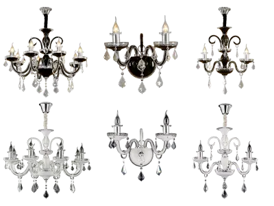 Каркас изделий — металлический, корпус из белого стекла дополняет прозрачный декор и аккуратные хрустальные подвески. Рожки с открытым патроном имитируют старые светильники, в которых использовались свечи.