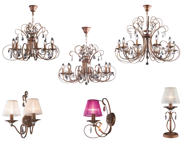 Корпус изделий — металлический, кофейного оттенка, с литыми декоративными деталями и украшениями из прозрачного хрусталя. Рожки открытого типа, рассчитаны на лампы с цоколем Е14. Светильники можно дополнить абажуром, однако их необходимо приобретать отдельно.