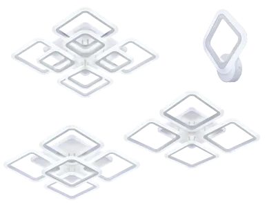 Корпус изделий — металлический, основание и модули квадратной формы. Люстры только в белом исполнении, бра имеют два классических варианта окраски: белый либо черный. Рассеивателем служит оптический акрил. Потолочные люстры невысокие, они идеально подойдут для помещений даже с низкими потолками, их можно устанавливать и на натяжные потолки.