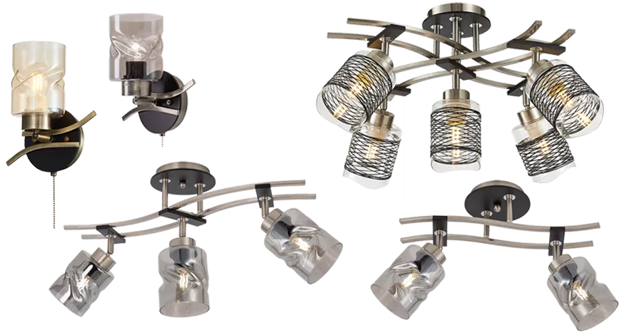 Основную часть коллекции составляют потолочные люстры: на выбор доступны модели с двумя, тремя, четырьмя и пятью плафонами. Дополняют серию настенные бра.