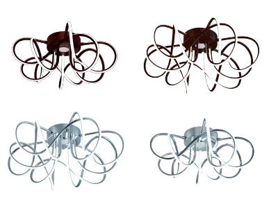 Основание светильников — из металла, витые рожки-модули из алюминиевого профиля дополнены рассеивателем из белого матового оптического полимера. На выбор представлено два силуэта (более плоский вариант и более объемный) и несколько цветовых решений: кофейный, хромированный оттенок или чисто белая модель. Светодиоды обеспечивают яркое и качественное освещение, потребляя при этом значительно меньше энергии, чем традиционные люстры с лампочками накаливания. Управлять люстрой просто и удобно благодаря инфракрасному пульту дистанционного управления.