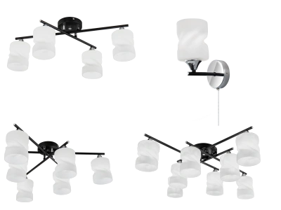 Корпус изготовлен из металла, черный оттенок дополнен декором цвета блестящий хром. Плафоны из белого матового стекла в люстрах располагаются попарно на горизонтальных штангах. Они имеют необычную форму: цилиндр немного скручен вокруг своей оси, образуя оригинальный силуэт.