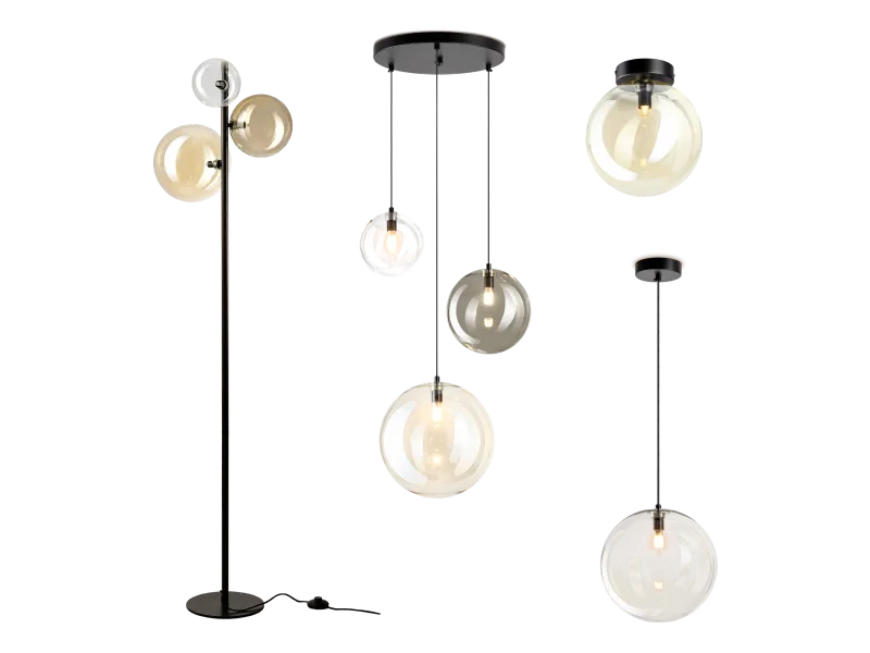 Корпус изделий металлический, черного цвета. Плафоны в форме шара, разного диаметра. В настенно-потолочных светильниках плафоны диаметром 20см, в подвесных — 20 или 25см; на выбор дымчатый оттенок или модный цвет шампань. В каскадных люстрах и в торшере плафоны трех размеров и трех оттенков: прозрачный, дымчатый и шампань. Высота подвесов свободно регулируется, для всех светильников используются лампочки с цоколем G9.