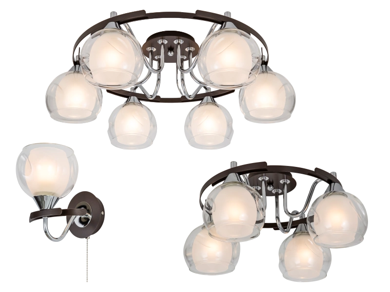 Каркас изделий изготовлен из металла, мягкий кофейный оттенок сочетается со стильными хромированными деталями. Стеклянные плафоны имеют двойную конфигурацию: внутренний матовый плафон купольной формы обрамлен внешним прозрачным плафоном в форме усеченной сферы. Благодаря особой форме плафонов, мягкий заливной свет распределяется максимально равномерно.