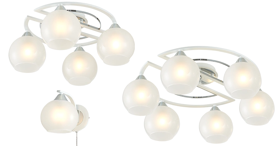 Корпус изделий изготовлен из белого металла и дополнен декоративными элементами цвета хром. Плафоны стеклянные, полуматового оттенка, в форме усеченной сферы. Их легко заменить — плафоны доступны для покупки отдельно. Благодаря форме и оттенку они дают уютный, заливной свет, мягко рассеивая световой поток по комнате.