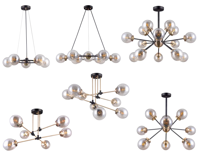 Высоту подвесных изделий можно свободно отрегулировать в зависимости от высоты потолков в доме. Во всех моделях используются лампочки с цоколем Е14, форма колбы — шарик.