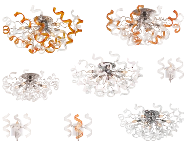 Люстры Рандом – это удивительный плод дизайнерских фантазий и сочетания холодного металла со стеклом в нескольких цветовых решениях. Необычные стеклянные завитушки, из которых состоит конструкция, придают ей воздушность и создают впечатление парящего стеклянного полушария на вашем потолке.