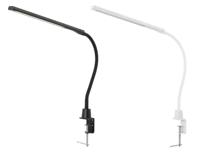 Прочное основание из металлического сплава крепится к полке или столу при помощи струбцины. Светодиодный модуль — из алюминия, с рассеивателем из оптического полимера, на гибкой стойке с силиконовой оболочкой, которая позволяет менять направление освещения под ваши нужды. Два варианта цветового решения — черный или белый.