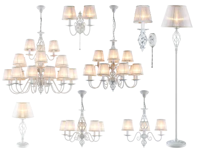 Коллекция Ровена состоит из подвесных светильников с количеством рожков три, пять, восемь, двенадцать и двадцать один. Все люстры и бра оснащены надёжным патроном из высококачественного углепластика с цоколем Е14, и возможностью использовать светодиодные лампочки без ограничений мощности, в торшерах же и настольных лампах встроен патрон со стандартным цоколем Е27 и аналогичными характеристиками.