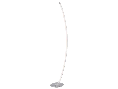 Металлическое основание и алюминиевая стойка светильника имеют стильный хромированный оттенок. Торшер очень легкий, но при этом достаточно устойчивый. Его просто собрать, инструмент для сборки входит в комплект поставки. Высота модели составляет 1,5м, диаметр основания — 25см, мощность — 12Вт.