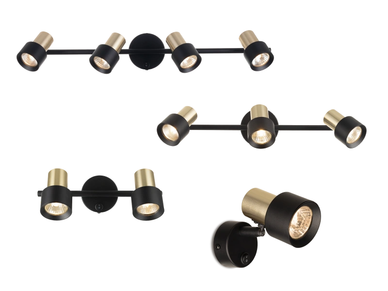 Основание и корпус светильников изготовлен из металла, окрашенного в строгий черный цвет. Плафоны украшены декоративными золотистыми элементами. Они имеют поворотную конструкцию, таким образом можно легко менять направление света уже после установки светильника. Кроме того, каждый плафон вращается независимо от соседних, так что можно создавать свой собственный, неповторимый рисунок освещения.