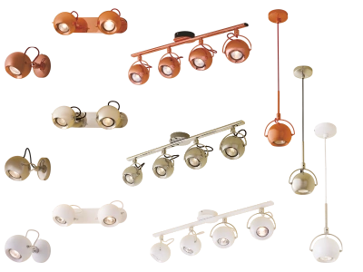 В коллекции представлены как одиночные подвесы с плафоном диаметром 25 и 30см, так и споты с одним или двумя поворотными плафонами.
