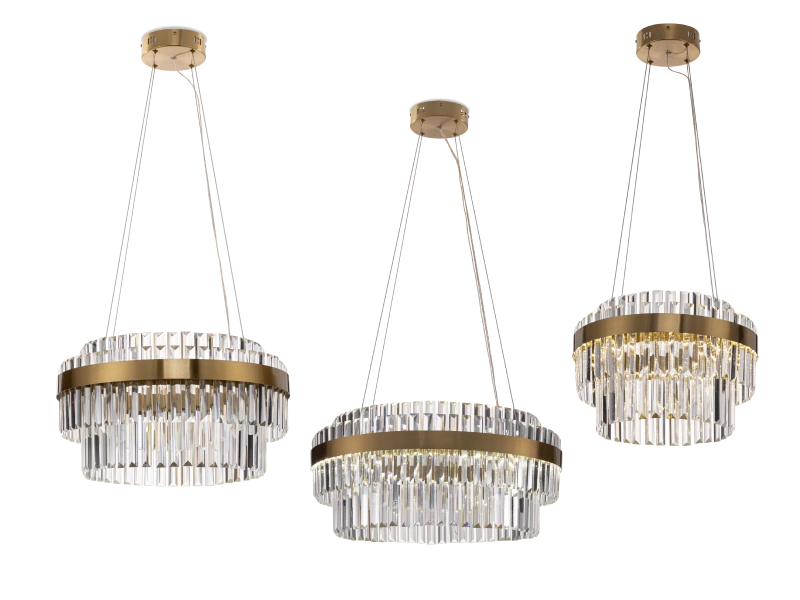 Корпус светильников изготовлен из металла с гальваническим покрытием цвета благородной бронзы. Каскад хрустальных призм, расположенных в несколько рядов, обрамляет широкое металлическое кольцо. Благодаря особой современной огранке, хрустальные элементы причудливо преломляют свет, рассыпающийся мириадами искр и бликов. Высота подвесов легко регулируется в зависимости от высоты потолков в помещении.