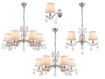 Корпус изделий из металла с хромированной отделкой, в качестве декоративных элементов используются хрустальные подвески с изящной огранкой. Абажуры из качественного текстиля выполнены в классическом белом цвете. Мягкий свет, проходящий сквозь полупрозрачную ткань, создаёт уютную атмосферу для отдыха и расслабления.